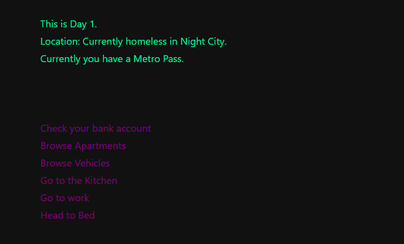 This is me trying out twine! I have always been interested in text based games so this was a fun little project!